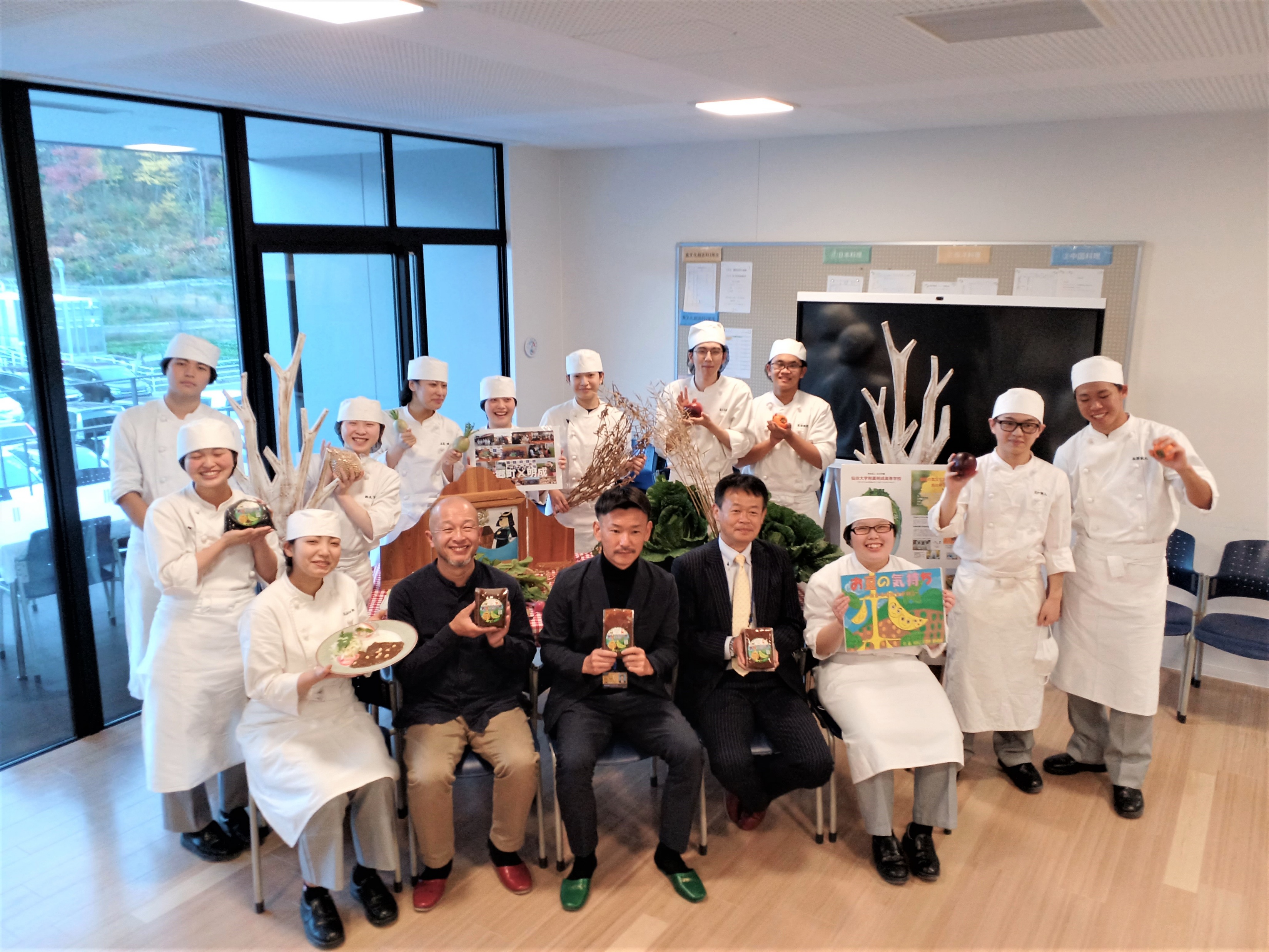 この様子は、地元テレビ局の番組のSDGsコーナーで「カレーで町おこし」として紹介され、取材にも堂々と受け答えする学生たちは頼もしいものでした。そして、2022年11月に「大郷みそカレー ~お豆の気持ち~」が完成しました。ベガルタ仙台のファン感謝の集いで、先行お披露目として限定100食が完売、翌12月に大郷町役場で試食&完成発表会を地元のメディアが集う場で行いました。