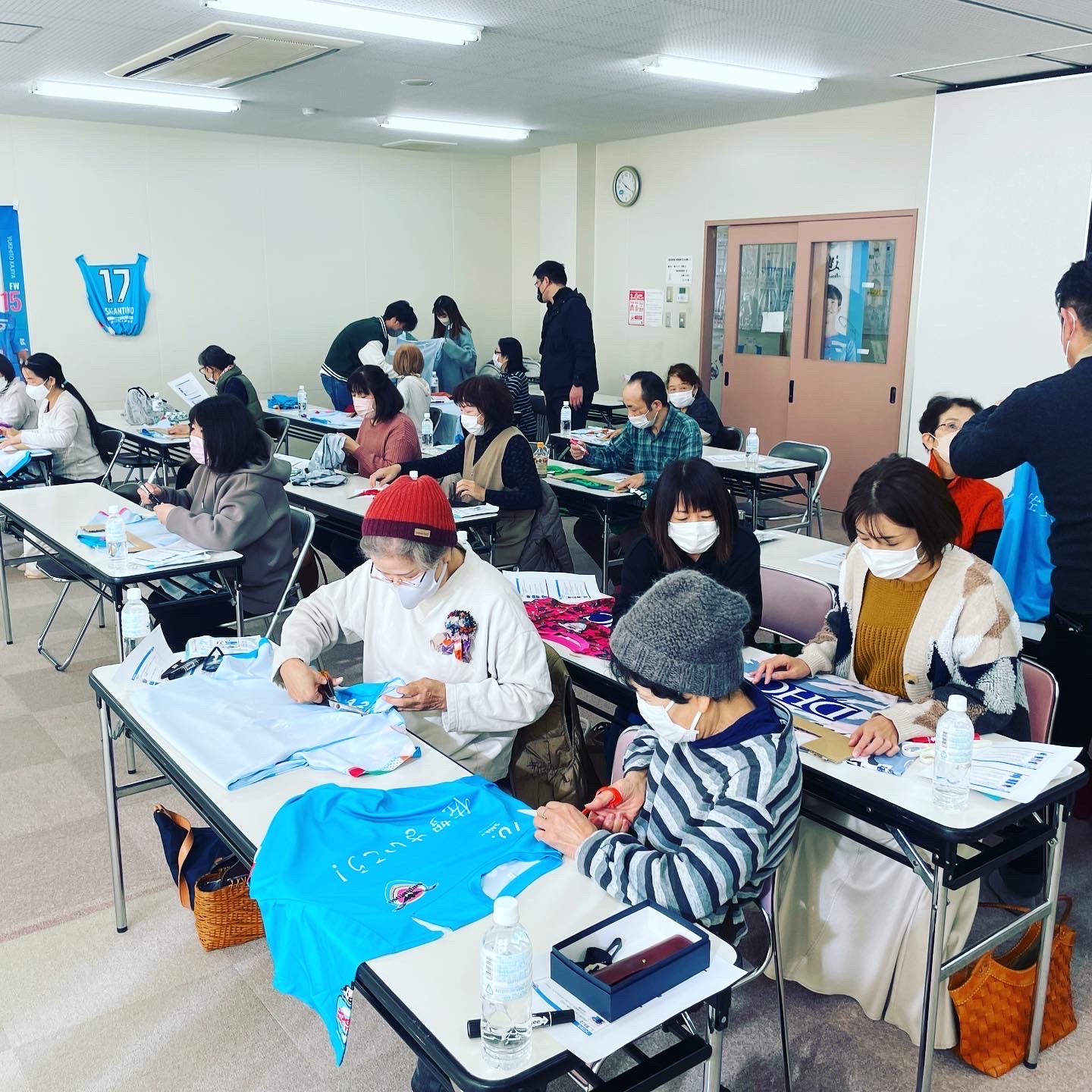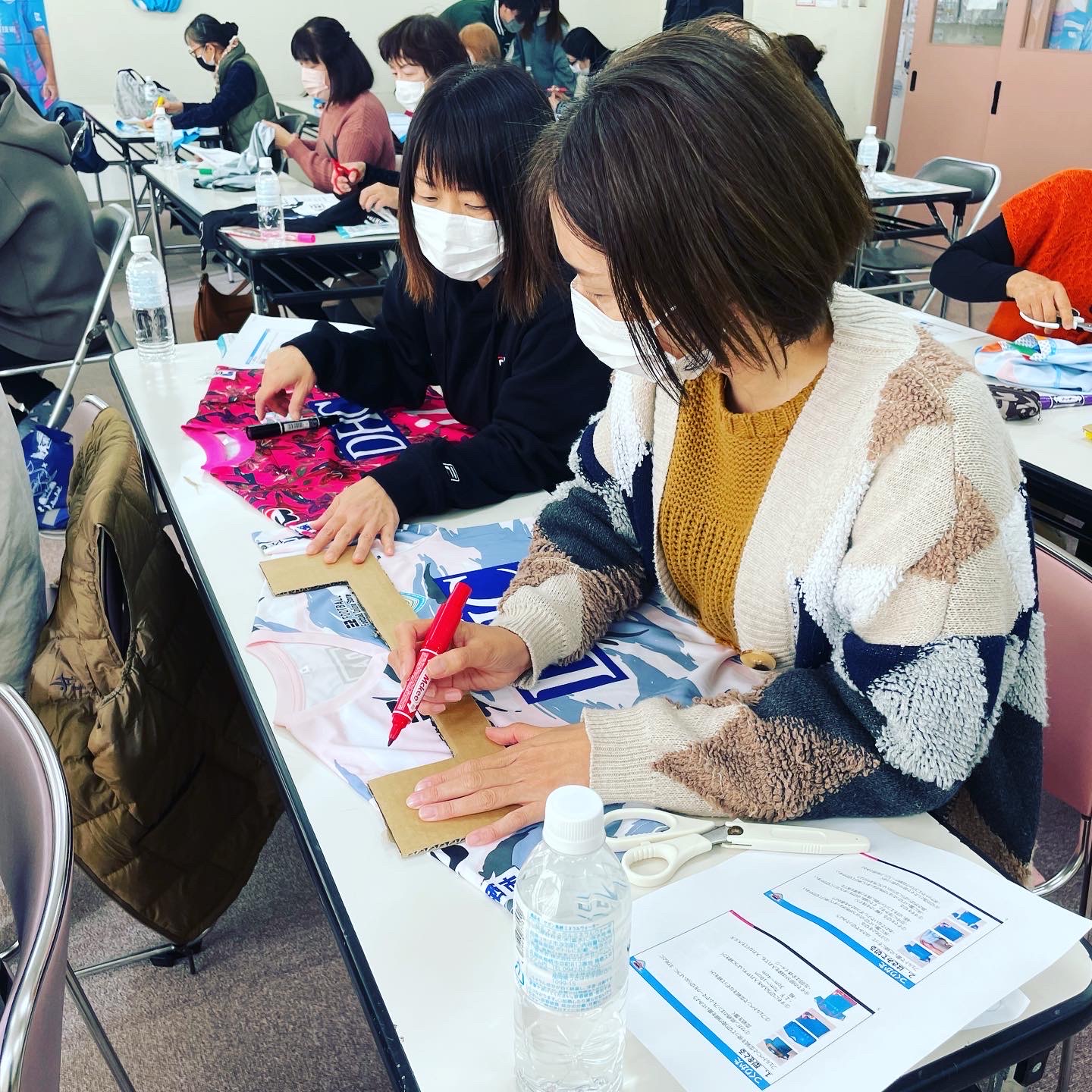 ホームゲームで配布した余剰となっていたユニフォームをリユースしエコバッグをつくるワークショップを開催。佐賀大学インターフェース科目スポーツイベントとボランティアリーダー授業にて佐賀大学生自らがサガン鳥栖・佐賀大学・地域の課題を解決する企画を立案。鳥栖まちづくり推進センターとも協働しワークショップを実施。夏休みは鳥栖地区の子ども向けに開催。そのワークショップを知った大人がまちづくり推進センターへ開催希望され、12月には大人向けのワークショップも実現し、エコバッグのみならず、ナップサックやエプロンなど制作し、来年度以降、小学校の裁縫の授業での取り組みを目指すことになっています。