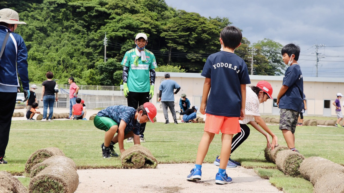 あの時あきらめなくてよかった。2022年クラブで作った芝生をみんなで運んで小学校を芝生化、その上で選手たちがこどもたちと本気で遊ぶ。2003年から続く地域のガキ大将づくり「復活!公園遊び」と2017年に始めた芝生で地域課題解決を目指す「しばふる」という2つのシャレンがつながることができました。