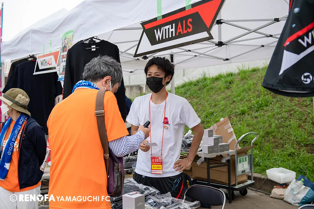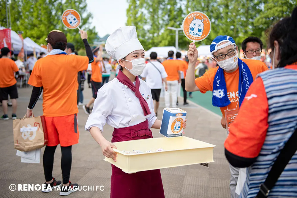 レノファ山口は、プロスポーツチームの持つ、「発信する力・繋げる力」を活かし、地域の課題解決に取り組んでいます。【ALSアクションデー】は、一般社団法人WITH ALS様とのご縁から始まり、田辺三菱製薬株式会社様の協賛の元、数多くの団体が関わり、神経難病であるALS(筋萎縮性側索硬化症)の疾患啓発を目的として開催させていただきました。ALS患者の皆様への観戦招待による当事者の参加だけでなく、地元高校生や、治療薬を製造されている従業員の参加など、多くの方々が、それぞれの立場からALSを捉え、発信することができました。
