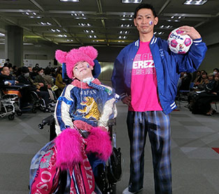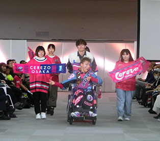 セレッソランウェイでは、重度心身障害者のサポーターがモデルとなり、リメイクされた応援ウェアーを身に纏い、力強く歩きました。