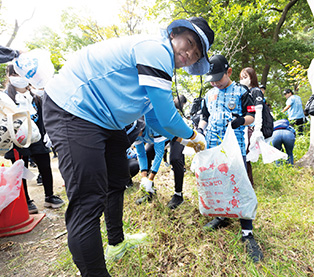 2008年から川崎フロンターレが継続的に続けている清掃活動。川崎フロンターレとしてゆかりのある場所をきれいにしたい、そんな想いが集結した、選手会主催の「等々力緑地清掃活動 Supported by ヨネヤマ」。今回初の試みとして、日頃ホームゲームでお世話になっている等々力陸上競技場がある等々力緑地を、川崎フロンターレの選手・スタッフ、そしてサポーターや近隣住民の皆さまと一緒に綺麗にしたいという想いから実施に至りました。参加人数449名のすべての皆さまと互いに交流をしながら清掃活動や緑化美化活動を行いました。
