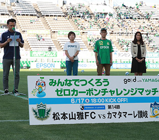 行政や企業、市民活動団体等にもご協力いただき迎えた、ゼロカーボンチャレンジマッチ当日。プロジェクト起案者の方々の表彰セレモニーの他、「サッカー×松本×水」トークショー、good with YAMAGAバスの運行、おさがり絵本のおあずかり会など、環境・エコに関するイベントや取り組みを実施しました。
