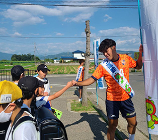 そんな素敵な活動に、昨年からAC長野パルセイロも参加させていただいています。昨年は計4回、選手が小学校に行き、あいさつ、ハイタッチで子供たちとコミュニケーションを取りました。選手から子どもたちにパワーを送ると、子どもたちからも元気をもらえます。