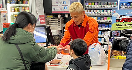 未経験のレジ打ちやスキャンにもすぐに適応し、手際よく業務を進める姿が印象的で、選手のレジに並んでくださった多くの道民の皆さんに対して丁寧に接客、ファンサービスを行っていました。