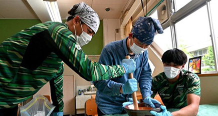 参加5選手は、米粉作りを一緒に行う皆さまとの交流を深めました。すりばちを一緒に持ち、そしてもう一人はお皿が動かないように、分担して擦りこみ作業を行いました。腕が疲れてきたら、バトンタッチ!選手同士だけではなく、エイトピア工房の皆さまと楽しく作業を行いました。