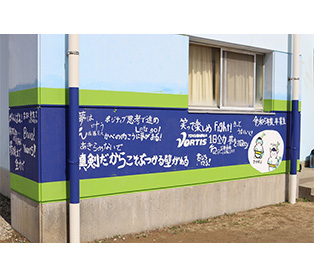 南海プランナー様と徳島ヴォルティスの協働事業として2023年にスタートした本プロジェクトは、これまでに合計3回実施しました。2023年10月に実施した第1回目は、選手3名が参加し、クラブハウスがある板野町の板野南小学校において塗装がはがれかけた壁を塗り直し、今でも遊び場として多くの子どもたちが利用しています。2024年3月に実施した第2回目は元選手でフロントスタッフである佐藤晃大CCO、石井秀典CCOが参加し、試合開催時に臨時駐車場として利用させていただいている鳴門市の里浦小学校の壁を子どもたちと一緒に塗り直し、臨時駐車場として使われた際には多くのサポーターの皆さまに喜んでいただいています。