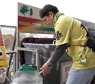 さらに10月4日のホームゲームからは、毎試合、久保庭良太選手が出演する使用済み割りばし回収の啓発動画をスタジアムビジョンで放映。選手の言葉と映像を通じて、回収の目的や意義を伝えることで、来場者の理解促進と参加意欲の向上を図っている。