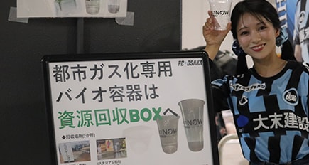 再資源化への取り組みの一つとしては、大阪ガス株式会社との連携により、都市ガス原料化に向けた実証実験へと繋げており、カーボンニュートラルな燃料の生成へと繋げる循環型の取り組みとして、スポーツを起点とした再資源化の先駆けを目指しています。