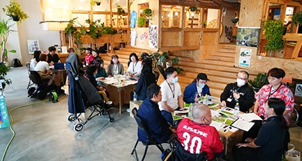ワークショップは、シーズンチケット購入者、車いすご利用の方4組と、ご家族に障がいがある方、福祉事業に関わっている方などにご参加いただき、そこに宇野さん、いわきFCフロントスタッフが加わり行いました。