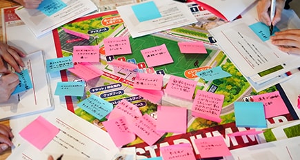 まず、現在のホームスタジアムでの課題や、こんなサービスがあれば良いといった意見をグループごとに付箋に書き出し、出た意見を全体で共有しました。その後、新スタジアムのイメージパース図を使って、新スタジアムにはこんな施設やサービスがあったらいいなというアイデアを、皆さんにたくさん出していただきました。