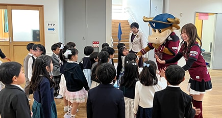贈呈式では、クラブマスコットのモーヴィが登場するほか、神戸市消防局の協力のもと防災講話も実施しています。