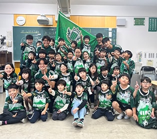 信州大学教育学部附属松本小学校の取り組みで「総合的な学習の時間」という学習があり、教科の枠を超えた横断的・探求的な学びを通して、児童が自ら課題を見つけ、考え、より良く解決しようとする力を育むことをねらいに実施されています。地域に根ざした活動をしている松本山雅FCを学びの中核に据え、生徒たちが「社会」と「わたし」を結びつけて考える探求的な学習に年間を通して取り組み、地域社会の多様な魅力や課題に触れる機会を設ける運びになりました。松本山雅FCとの出会いと学びの起点は公共施設の見学で練習会場を訪れた際に、TOPチームの全選手が児童に駆け寄り、ハイタッチを交わしたことが、学習に大きな影響を与える契機となりました。