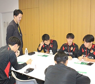 まずU-18の選手たちは、インプットセッションにて希望の光の山家さんから「ブラジルルーツの方々の現状」について学びました。さらに、ジュビロ磐田選手OBで社会連携活動を実践されている山田大記さんや、現在は株式会社マイナビで働く名古屋グランパス選手OBの磯村亮太さんから「スポーツの与える力」について伺い、理解を深めました。その後、保見団地を訪問し、生活環境の見学やブラジルキッズとの交流を通じて、彼らの抱えている社会課題の実態を現場で体感しました。