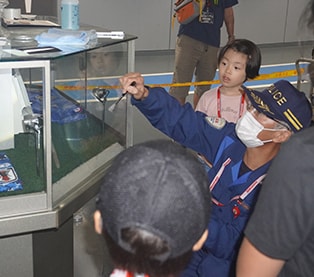 指紋採取では、鑑識課の方から教わりながら、実際の鑑識の道具を使って子供捜査員たちがスパイクが盗まれたショーケースに残った指紋を採取していきました。指紋にはいくつかの型があり、また指紋は誰一人同じ人はいないこと、一生変わることはないこと、というお話しを聞いて、保護者(イベント内は記者という立場で規制線の外から子供たちの捜査を取材中)も大きくうなずく場面も。
