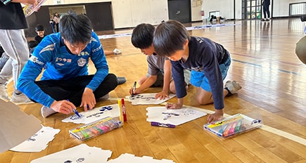 こどもたちは、自分たちの手で、選手入場時に掲げる応援グッズを制作していきます。この取り組みで大切にしたのは、「応援を教える」ことではなく、「一緒につくる」こと。