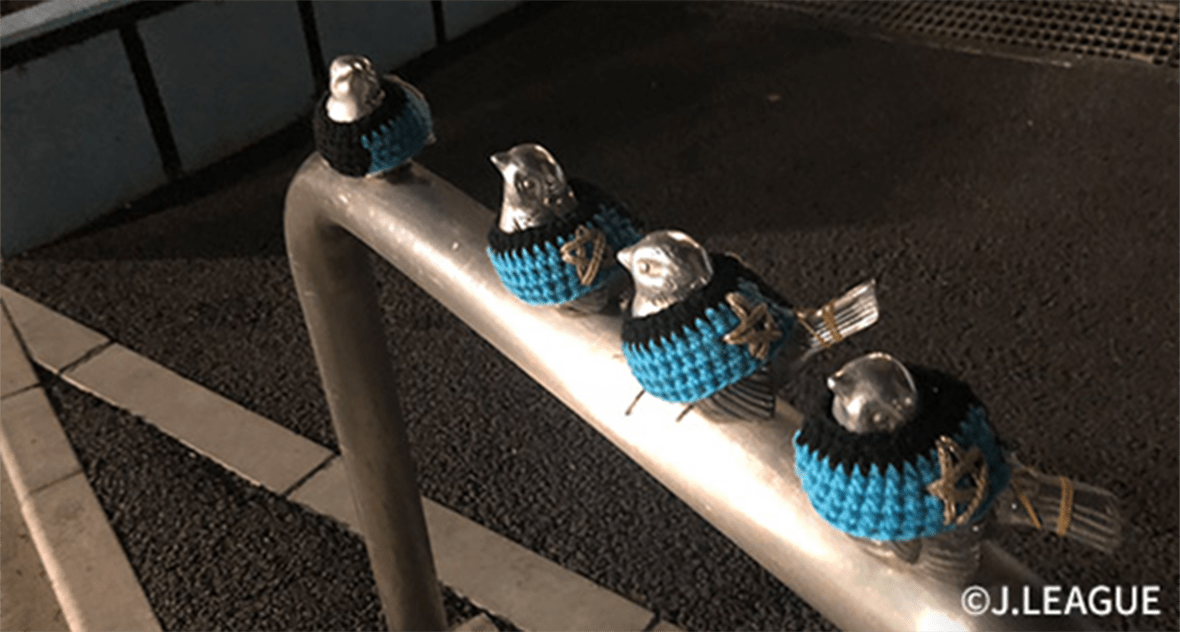 「あ~、今日も1日長かった!」と暗闇の中をバス停に向かって急ぐ帰路。あれだけにぎわいのあったフロンパークも、元通り。日中の人混みが嘘のよう。「あ!これですよ、ヨネさん」とスタッフから声をかけられる。なんと、公園の柵に乗っている小鳥に、フロンターレカラーのニット衣装がかけられている。こういう何気ない日常が、Jクラブのある風景なのかもしれない。これを全国に。まだまだ私たちの挑戦は続く。