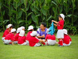 芝生のお手入れは、先生方のお仕事なので、私たち保護者はただただ感謝しつつ、夏涼しく、冬は暖かい芝生のサッカー場の特権を亨受しながら、サッカー場で歓声を送るのです。 週3回の部活動や、週1回のOBサッカー部はもちろん、未就園児のサークル活動や、園児たちのピクニックにも活用される芝生の広場は、子ども達の胸にすばらしい思い出の場所となって、根付いているに違いありません。