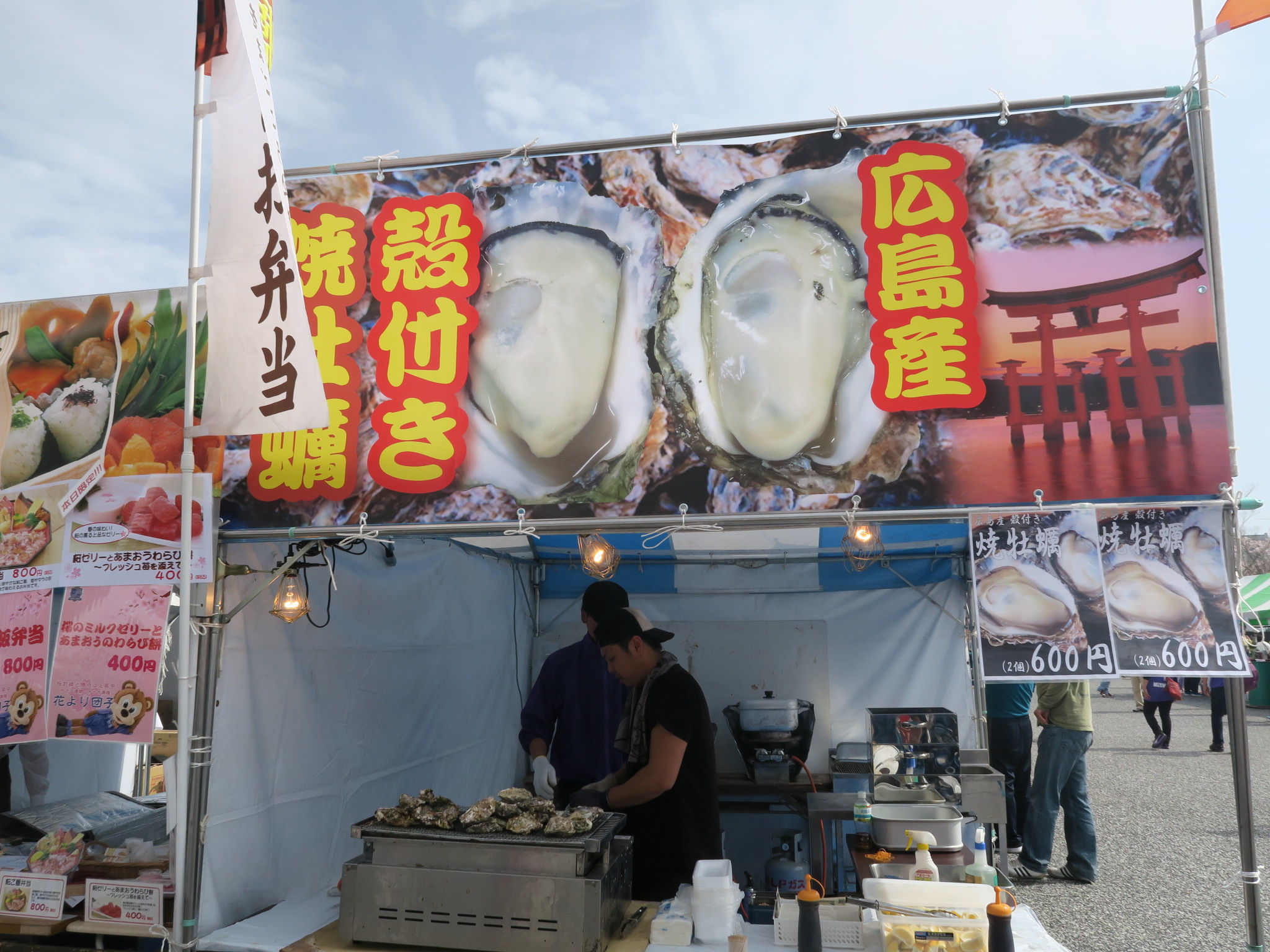 ずらっと並ぶブースには、王道系のメニューはもちろん、焼牡蠣やお好み焼きなど…