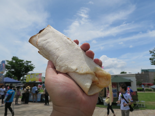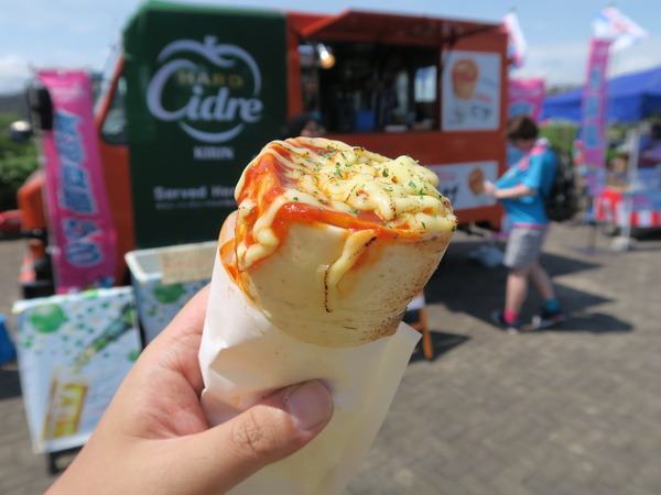 片手で食べ歩けるピザドックにはチーズがたっぷり入り、サガのサービスはサスガ。