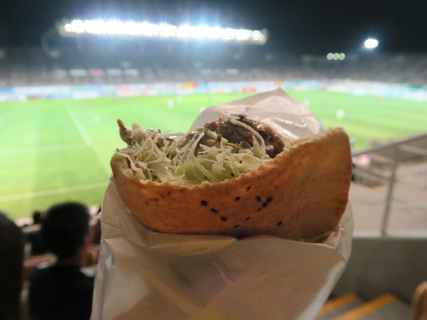 肉と野菜たっぷりなクリーミーソースのケバブを片手に、試合の行方を見守りました。