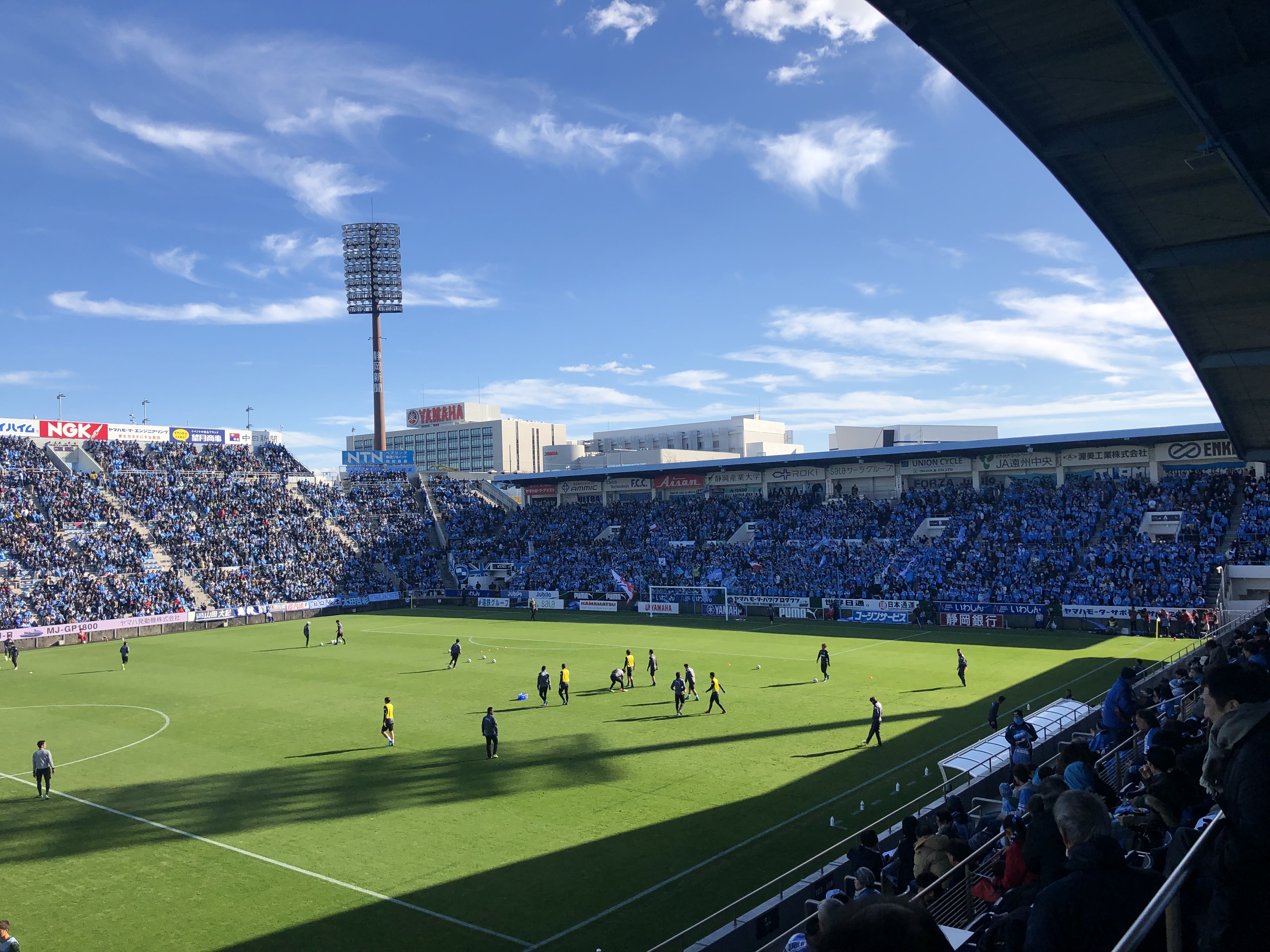 会場となるヤマハスタジアムに向かう。東京から新幹線で掛川駅へ。乗り換えた在来線のホームは風が強い。この風が果たしてどちらの味方をするのか?ジュビロ磐田のサポーターそして、東京ヴェルディのサポーター。どちらもホームで浜松行きの電車を待つ。
