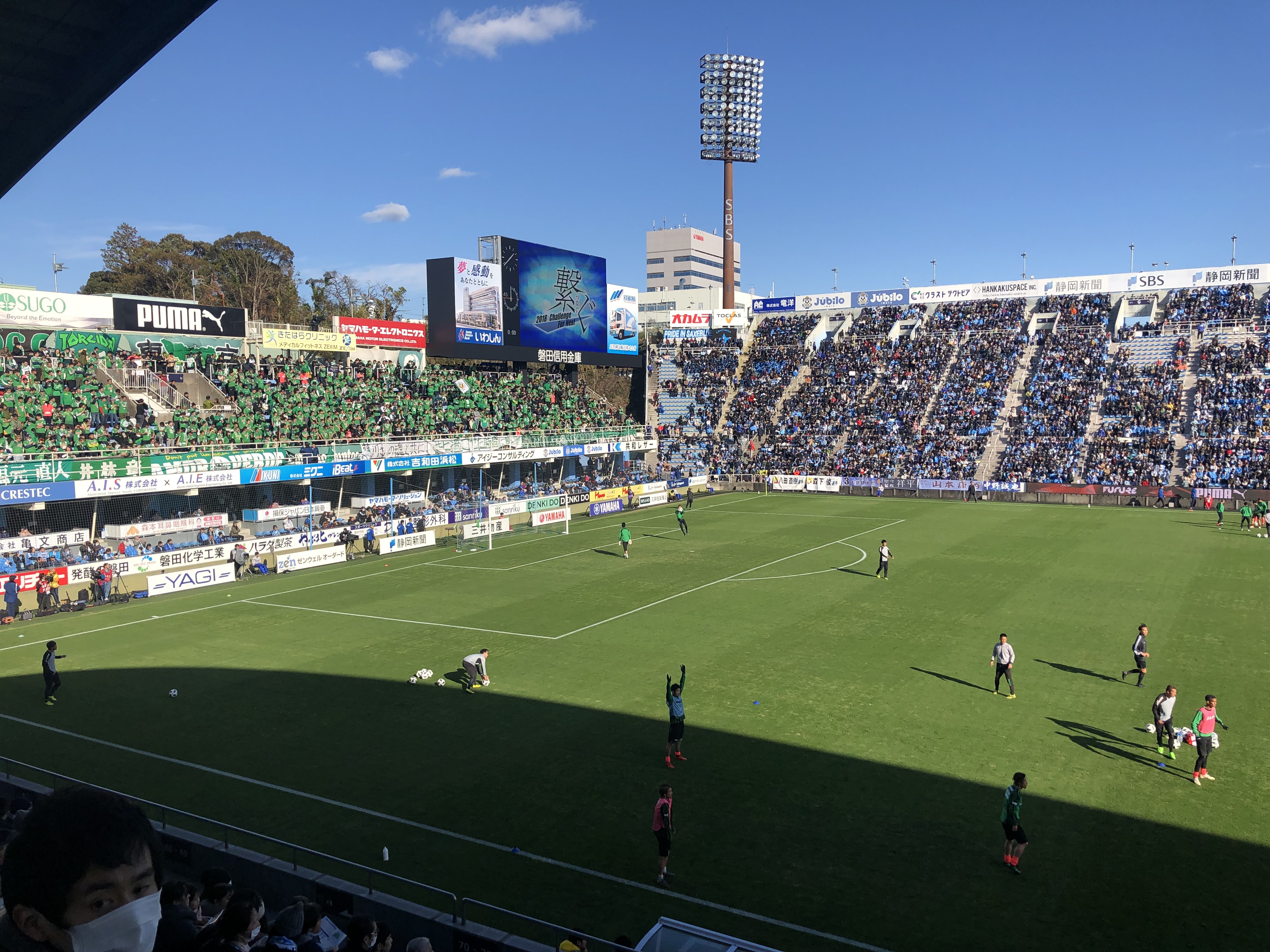 両チームともに、ウォーミングアップ時から熱狂的な応援を続けている。J1参入プレーオフは90分で残留・昇格が決するレギュレーション。ホームのJ1・16位磐田はドロー以上で残留が決まる。J2・6位から1回戦、2回戦を勝ち抜いてきた東京Vはこの試合も勝利が必須だ。
