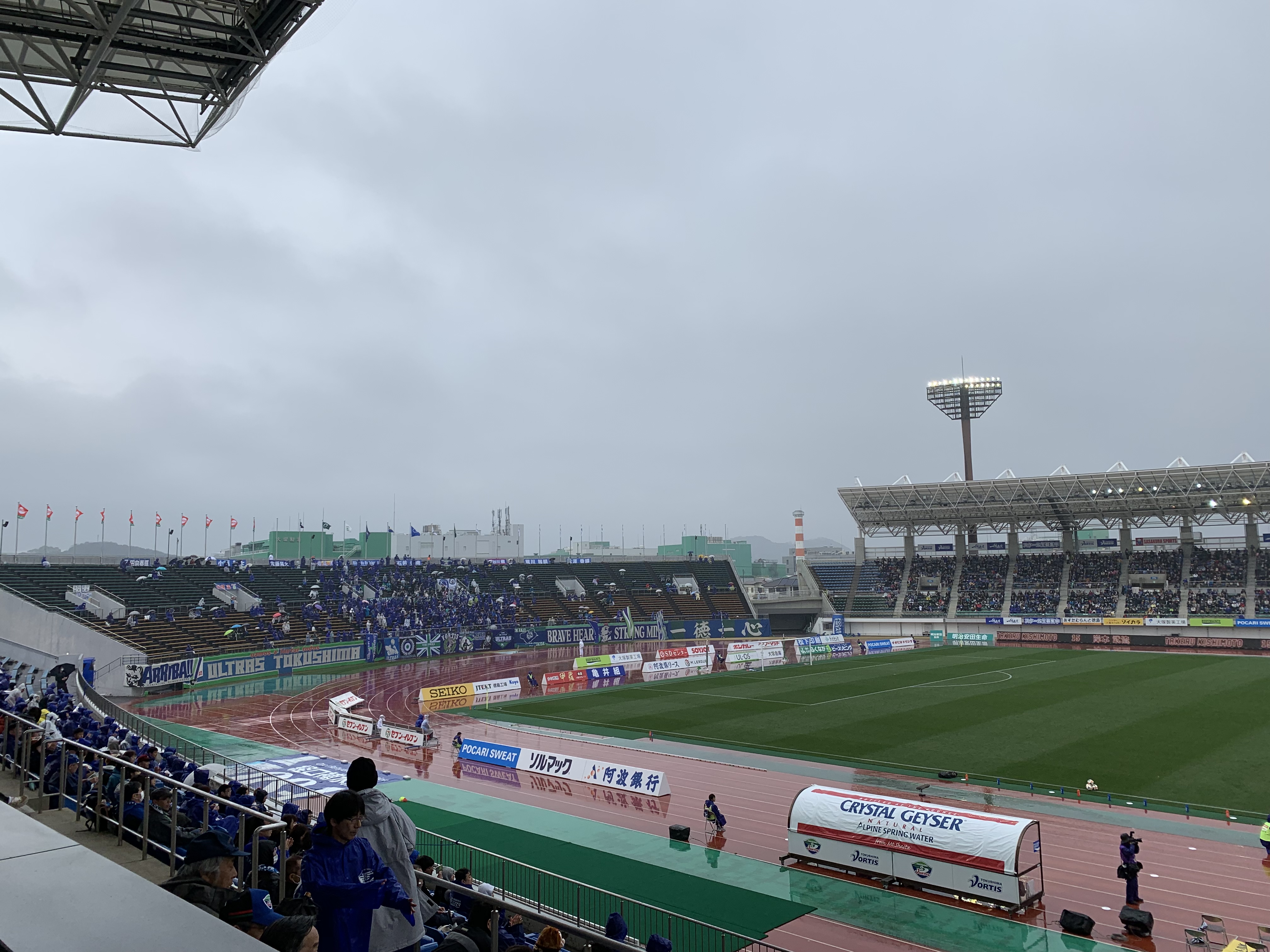 遠く徳島まで駆け付けた新潟サポーター。迎えるホームの徳島サポーター。ともに雨にもかかわらず、熱心に応援する。