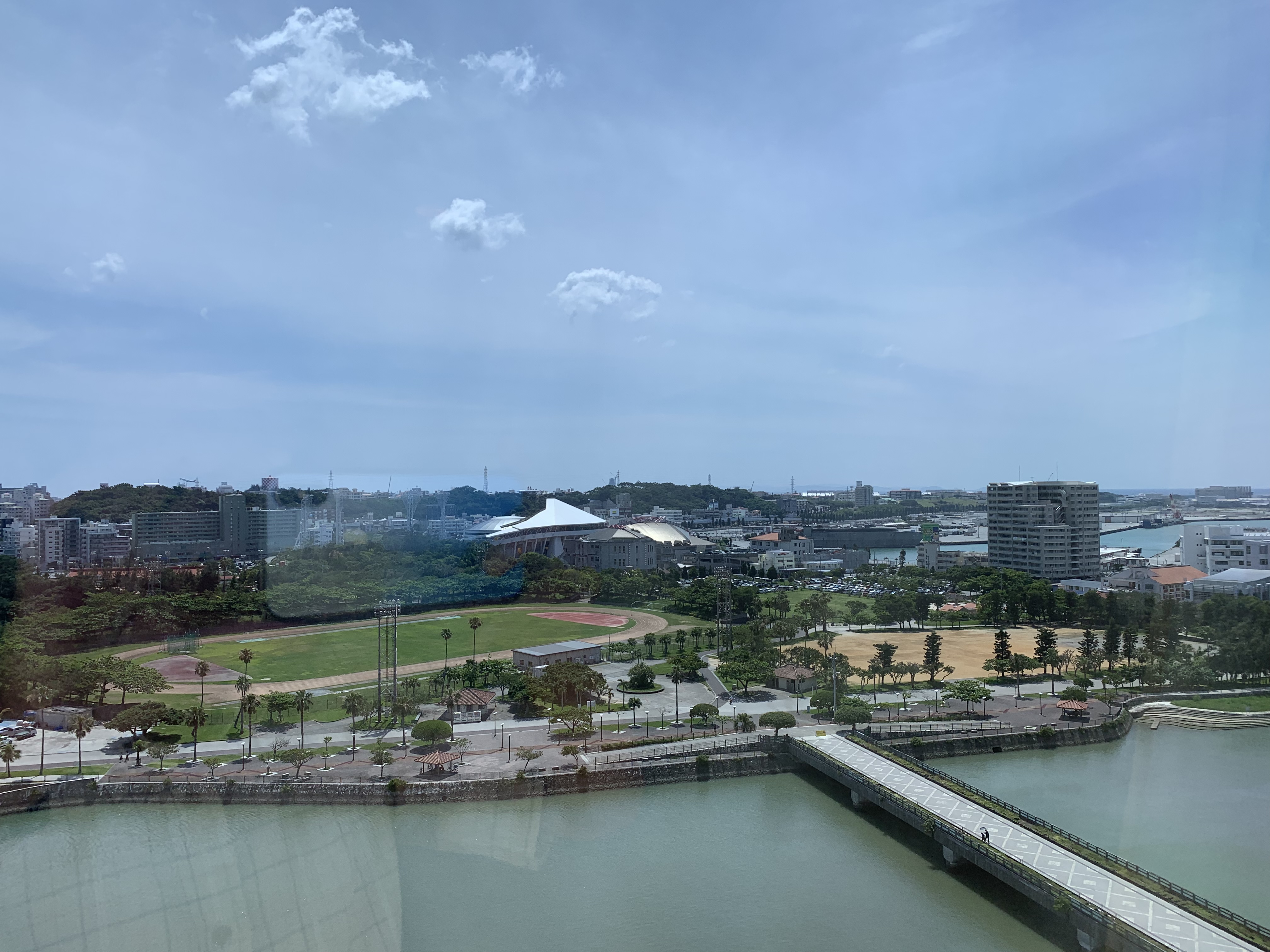 泊まったホテルの目の前に奥武山公園陸上競技場がある。ここに新しいスタジアム建設が予定されている。沖縄都市モノレール「ゆいレール」壺川駅の目の前。隣の駅、奥武山公園駅からもつながっている。空港から1本でもあり、アクセスは抜群の場所だ。奥に見えるドームは、野球場の沖縄セルラースタジアム那覇。この日の沖縄は、30度を超えた東京や北海道より涼しく、到着した時で28℃。日陰は特に涼やかだ。