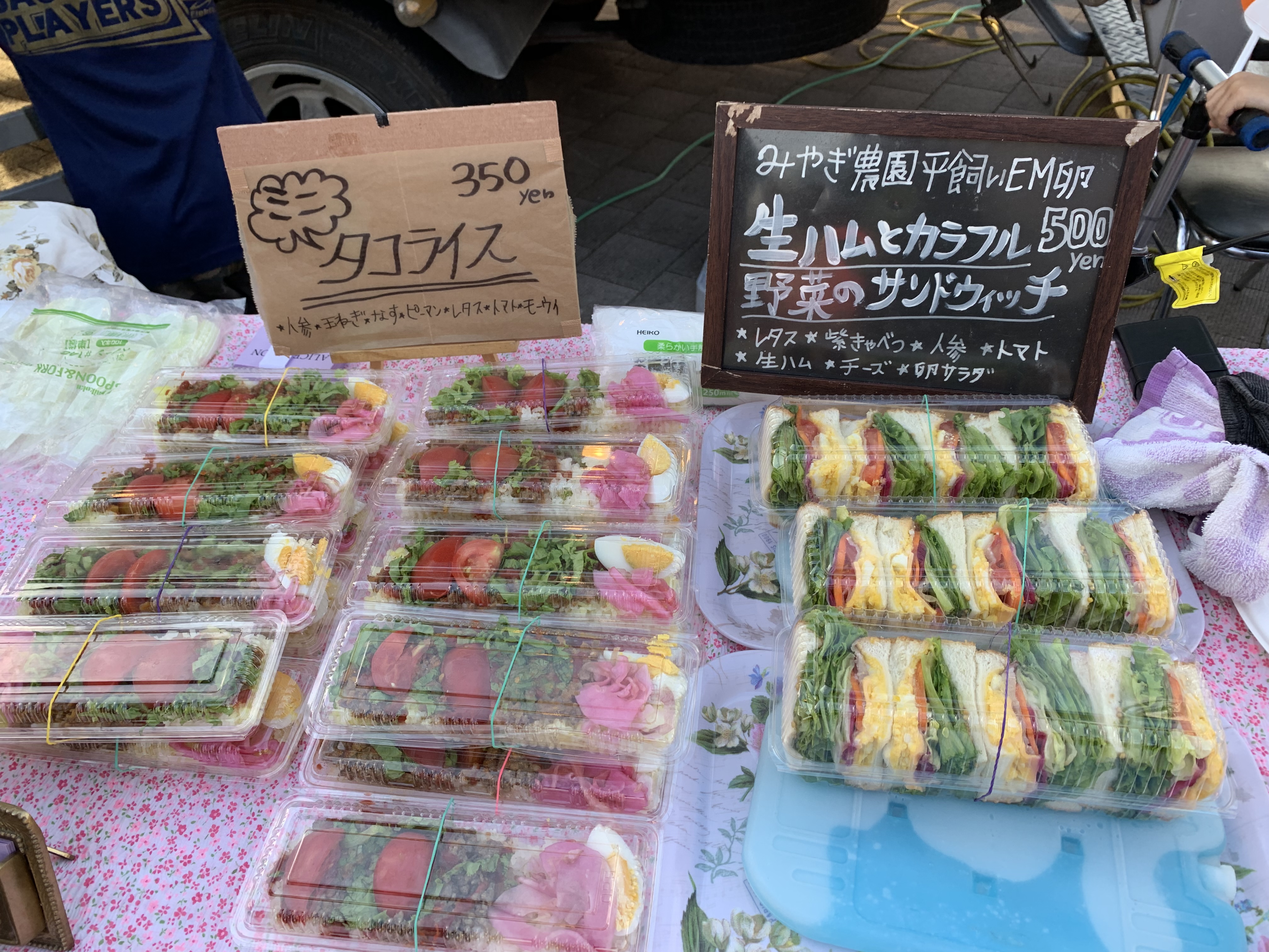 ここはスタグルがかなり充実している。タコライス 350円。生ハムと野菜がいっぱい詰まったサンドウィッチ 500円。安い!迷ったあげくサンドウィッチを購入。