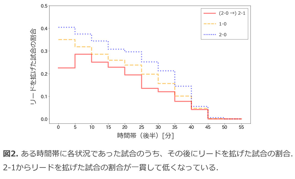 もちろん、冒頭のデータの通り、2-0という状況自体は危険ではない。図1・2における青色のドット線が示すように、2-0は同点に追いつかれにくく、かつ追加点が入りやすいため、非常に安定した状態である。しかし、そこから1点返されて2-1になると、同点に追いつかれる可能性は高まり、2点差に戻せる可能性は低くなってしまう。