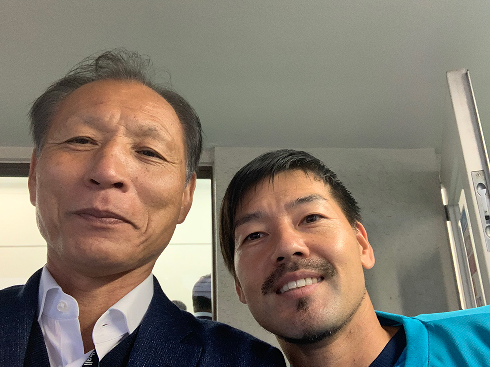 下平隆宏監督(向かって左)、そして服部健二GMと記念撮影。服部GMとは私がFC東京の監督時代、強化担当として一緒に戦った仲間だ。横浜FC契約担当の福田健二もFC東京時代に一緒の仲間。残念ながら写真を撮り忘れた…。