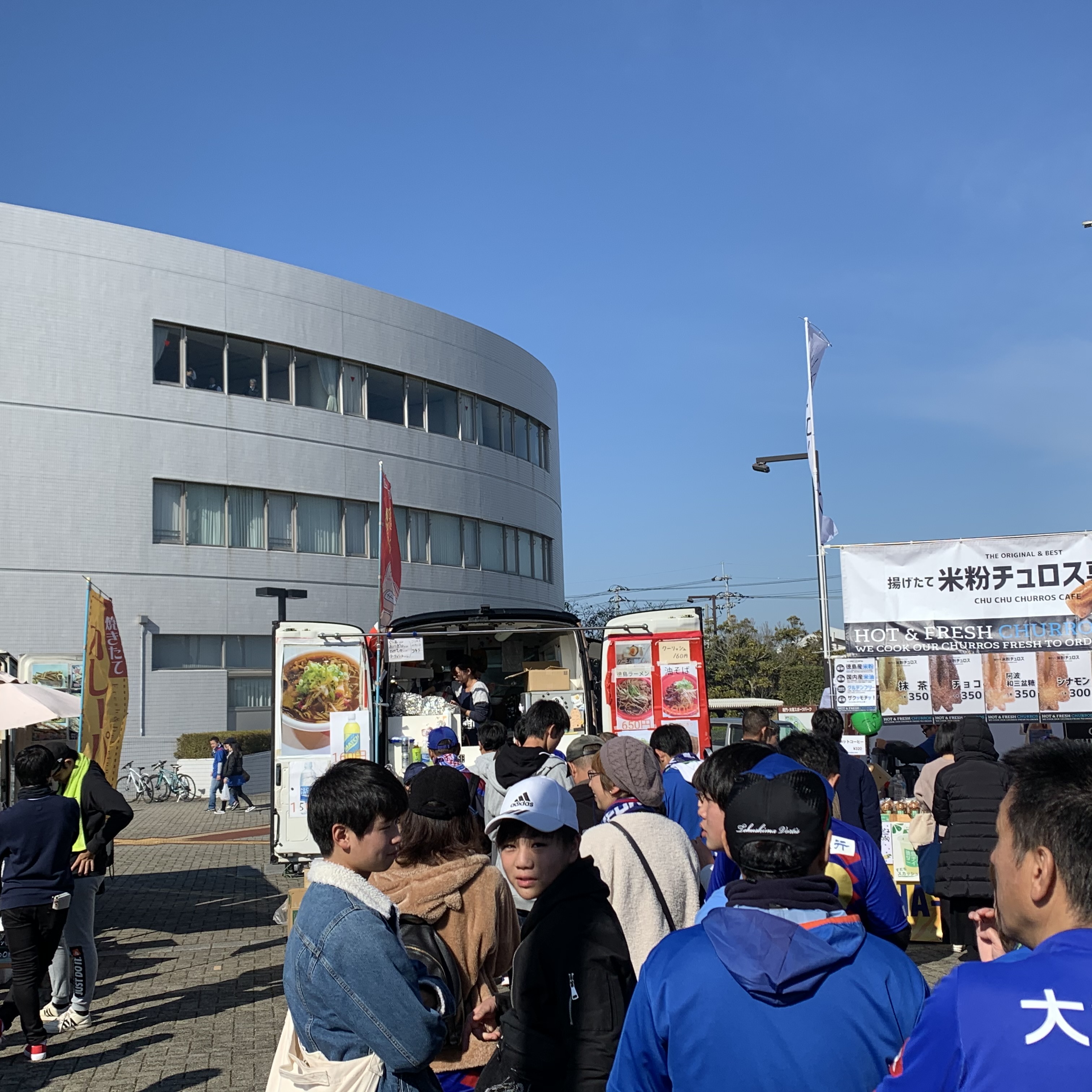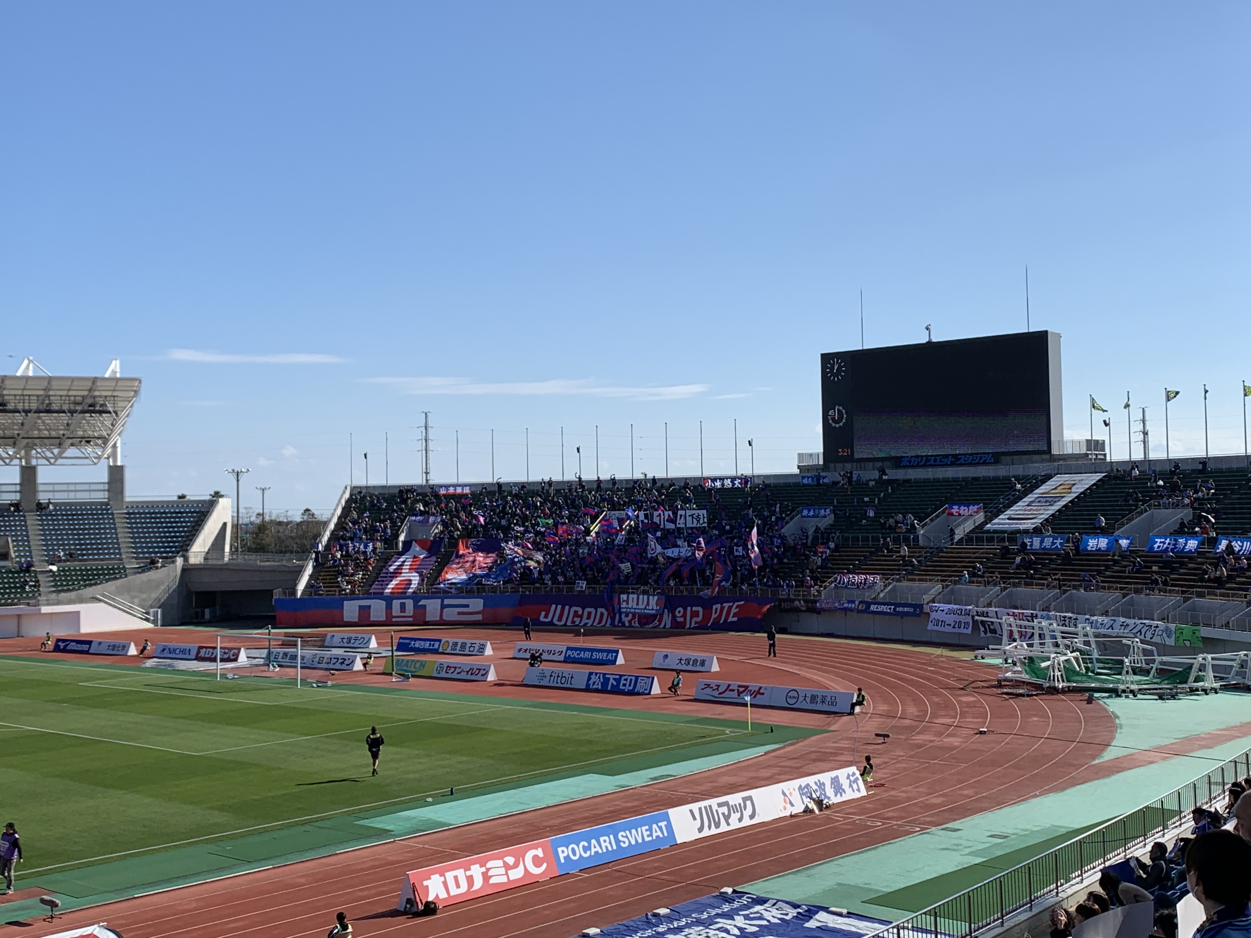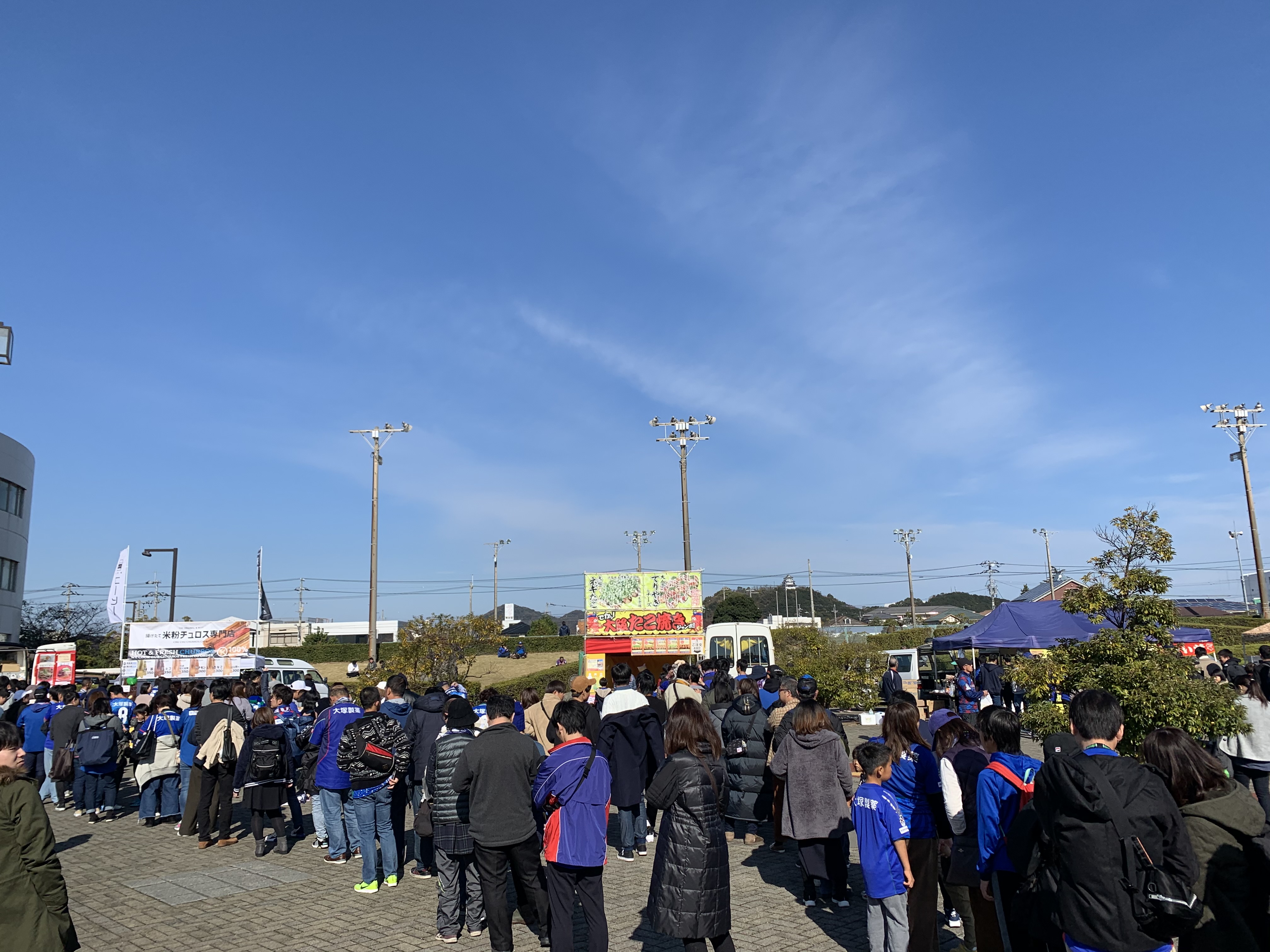 快晴の鳴門・大塚スポーツパーク ポカリスエットスタジアム。甲府サポーターも多い。甲府から臨時バス3台のほか、高松までLCCで来て、そこからのレンタカー組や、甲府から車組もたくさんいた。本当にありがたい。
