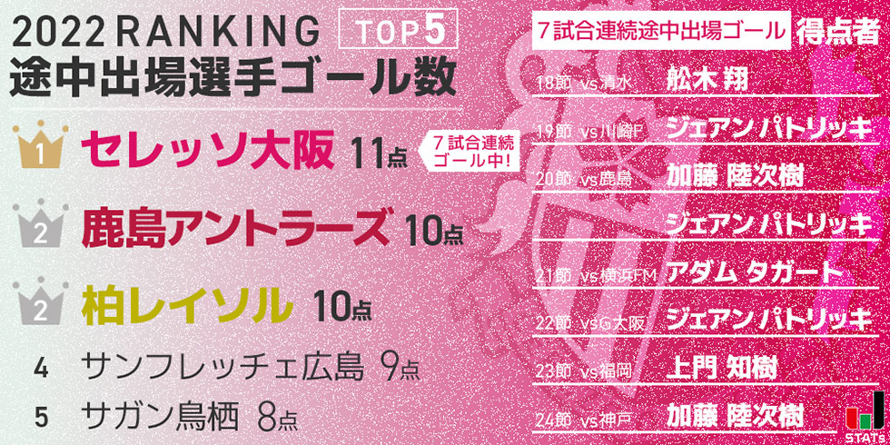 今季、「ジョーカー」の存在が最も脅威になっているクラブの1つにセレッソ大阪が挙げられる。ここまで途中出場選手によるゴールが11点とリーグで最も多く、オウンゴールを除くチームの全37点中、約3割を途中からピッチに入ったプレーヤーが奪っている。さらに特筆すべきは、第18節から直近の第24節まで、リーグ戦7試合連続で途中出場の選手が得点中だということ。この期間中は4勝3分けで無敗をキープしており、2試合で終了間際に決勝ゴールを挙げたジェアン パトリッキを筆頭に、ゲームを決める・救う「ヒーロー」が毎試合で現れている。一体感をベースにチームをまとめ上げる小菊 昭雄監督の下、誰が出ても遜色ないチーム編成に成功しており、この連続記録が今後どこまで伸びるのか、前述の川崎フロンターレの26点(1試合平均0.76点、今季のセレッソ大阪の1試合平均は0.46点)に迫れるかにも注目したい。