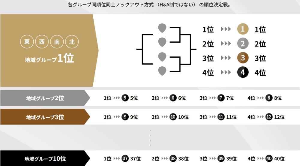 その後、5月30日から6月7日にかけて、プレーオフラウンドとして、地域リーグラウンドでの同順位同士で対戦を行い、最終順位を決定します。