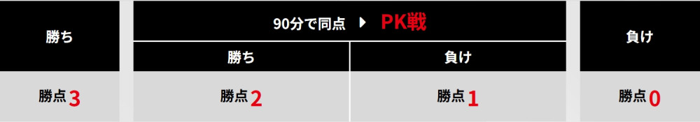 90分間で勝利をつかめば勝点3、PK戦の結果白星を挙げれば勝点2を得られます。PK戦の末敗れた場合は勝点1が得られるなど、獲得できる勝点の規定も例年のリーグ戦とは異なります。