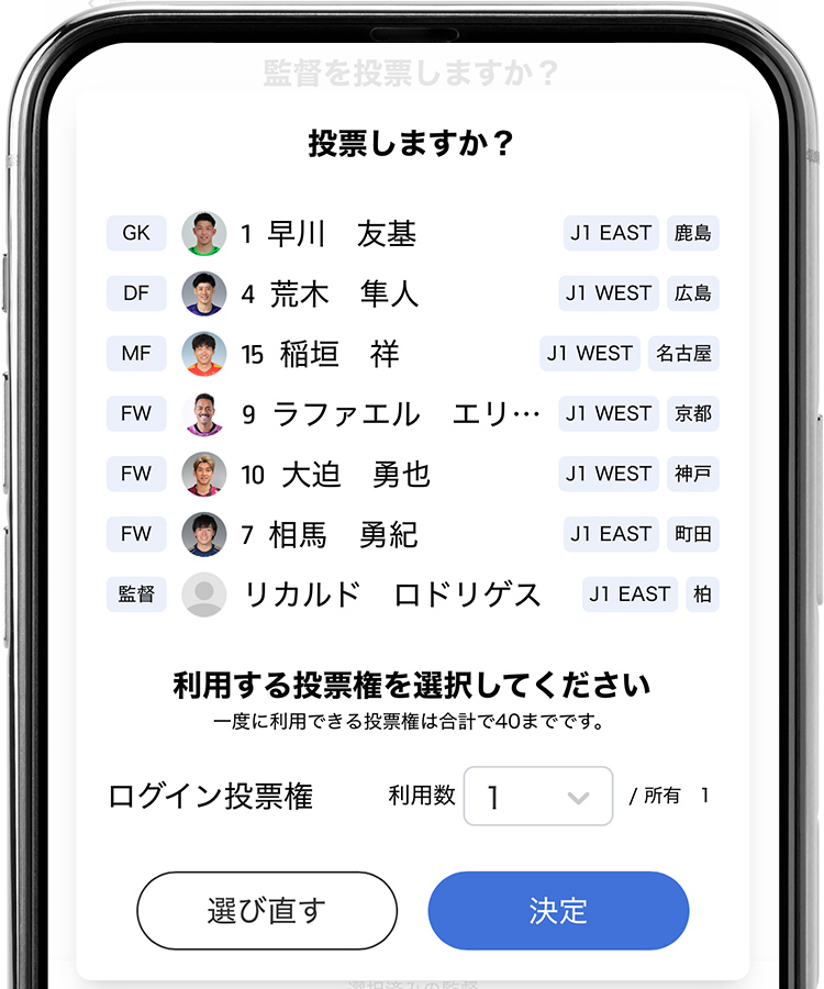 1投票権で選択した選手