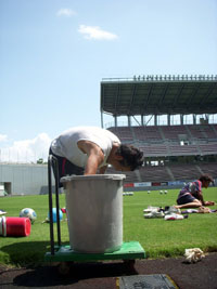 でも、何事にも一生懸命の野崎選手らしく、バケツの中の氷を真剣に選んでいました。