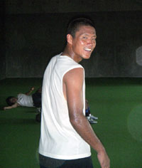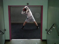 F/これも良く取れた一枚ですね。入口をフレームに見立てて、松本GMの運動姿を後ろから狙っています。