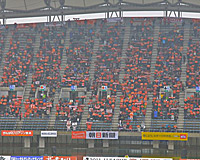 もうひとつ圧巻だったのが、ピッチに入る選手たちを迎える際のチャント。昨シーズンまではクラブ公式応援歌が流されていましたが、今シーズンからはゴール裏のサポーターが呼びかけて新しい試みがスタート。それは、トレーニングウエアスポンサーである高橋酒造さんのCMソングとして昨年製作され、熊本出身の歌手・水前寺清子さんが歌った「HIKARI〜輝く未来へ〜」という曲を、アカペラで歌うというもの(※クラブ公式サイトの動画メニュー→サポータータブ→2011シーズン選手入場コールで確認できます)。