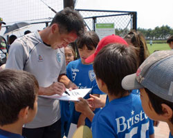 そして、福岡の町のサッカークラブの子どもたちがコーチに連れられてやってくるのも夏休みの光景のひとつ。サッカーをプレーする子どもたちにとって、おらが町のチームの選手たちは憧れの存在。ピッチでトレーニングに励む選手たちを一瞬たりとも見逃すまいと、真剣な表情で追いかける。そして、練習が終わると、選手たちがピッチから引き揚げてくる入口に並んでサインをねだる。あまりの勢いに入口は塞がれてしまって、選手たちは立ち往生することになるのだが、それでも選手たちは嫌な顔一つせず、順番にサインに応じて行く。元気をもらっているのは子どもたちだけではない。選手たちもまた、応援してくれる子どもたちから元気をもらっている。