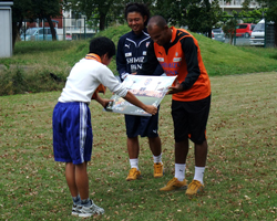 その後、パウロ選手から全生徒60名分のホームゲーム観戦チケット[10月25日(日)FC東京戦]とサイン色紙が贈呈され、最後に子供たちへ、「サッカーをしている子もしていない子も、目標に向かって努力をして、頑張ってください。」とメッセージが送られました。