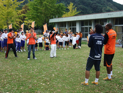 校庭には生徒たちが手作りした、パウロ選手の母国であるブラジル国旗が貼られ、小学部から高等部の全生徒60名からの大声援の中、パウロ選手が入場。自己紹介の後、まずはリフティングを披露し、プロの技を間近で見ることを楽しみにしていたと言う子供たちからは、とても大きな歓声があがりました。