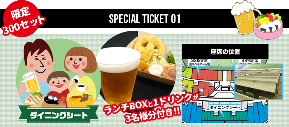 限定300セット。3名様分のランチBOX&ドリンクが付いた限定チケット。テーブルで食事しながらゆったり観戦できます。
