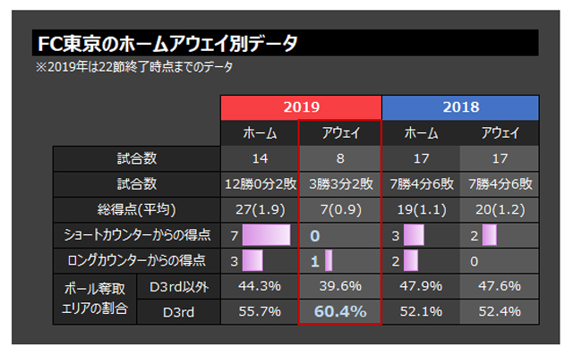 FC東京は、ラグビーワールドカップ開催の影響によりホームの味の素スタジアムを使用できず、第24節から第31節までをアウェイで戦うことになる。この過酷なアウェイ8連戦で、どれだけ勝点を積み上げることができるか。アウェイでの得点力をホームと近いレベルにまで引き上げることが、初優勝のポイントとなるかもしれない。