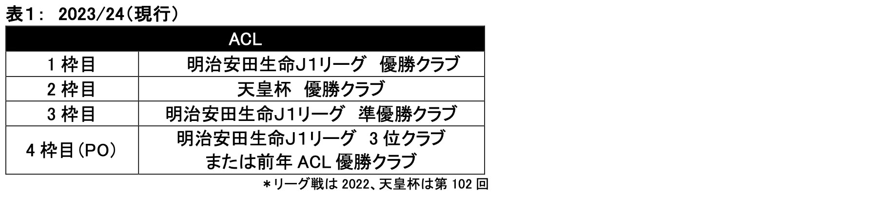 ※1:前年ACL優勝クラブは4枠目(PO)として出場。ただし、その場合における出場枠数は増えない(J1の3位クラブは出場しない)