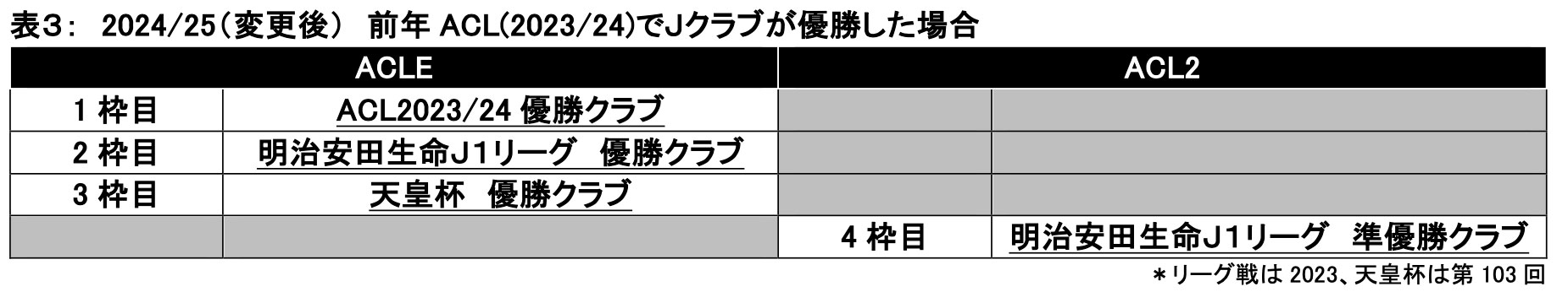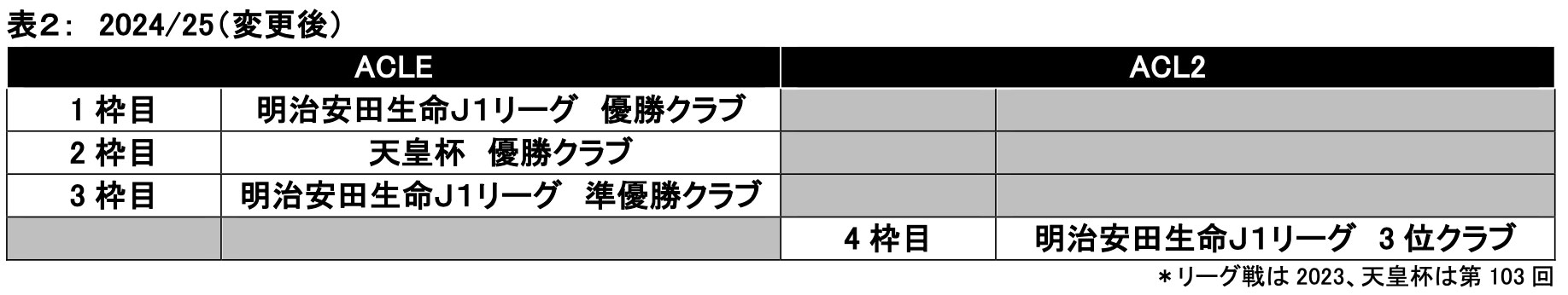 ※現在、日本はAFCランキング東地区1位のため上記出場枠となる。2025/26シーズンの出場枠(クラブ数)は、2023/24シーズン終了後にAFCランキングにより決定される(東地区2位の場合はACLE:本大会2枠+PO1枠およびACL2:本大会1枠の計4枠となる)