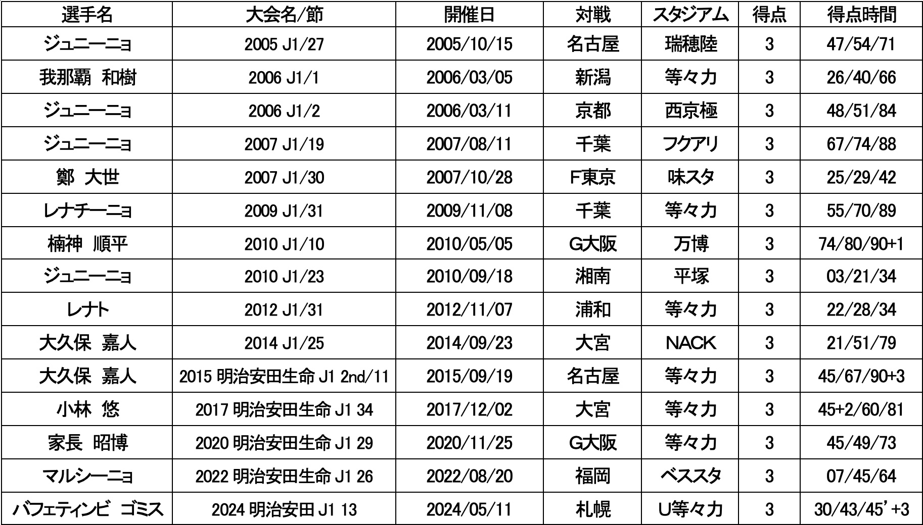 【川崎フロンターレ J1リーグ戦 ハットトリック一覧】