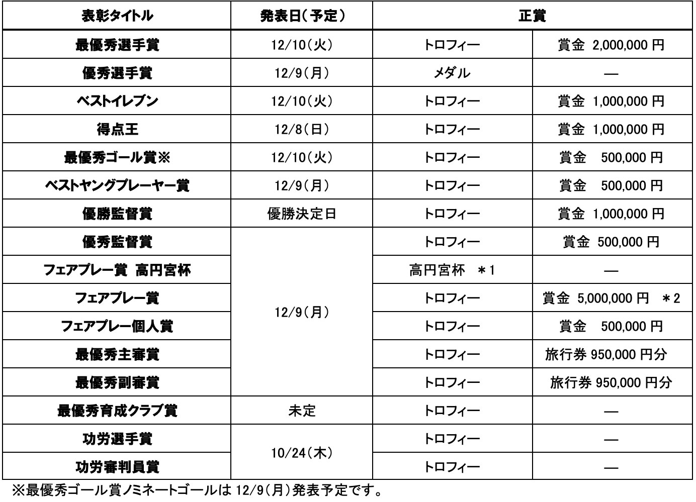 *2:明治安田J1リーグにおける反則ポイントの年間合計数が38ポイント以下のチームのうち、反則ポイント数が少ない上位3チームに対し、フェアプレー賞としてそれぞれ5,000,000円の賞金および記念品を授与する。ただし、反則ポイントが同数のチームが複数あることにより上位3チームに該当するチームが4以上ある場合、その全てのチームをフェアプレー賞とし、反則ポイントが同数となるチーム数の合計が4以上となる順位のチームについては、賞金5,000,000円を均等配分する。