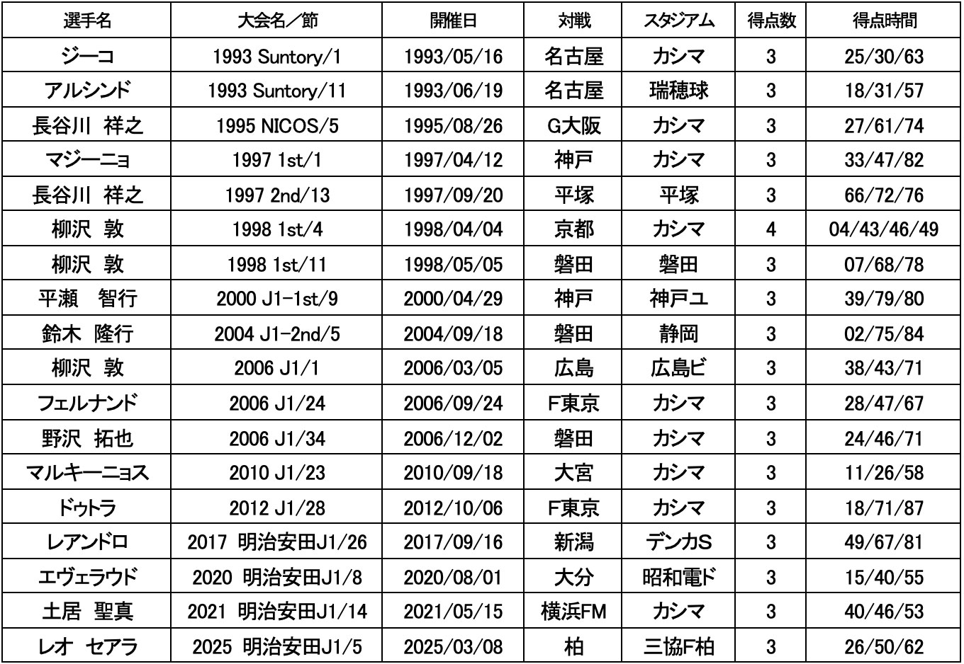 【鹿島アントラーズ J1リーグ戦 ハットトリック一覧】